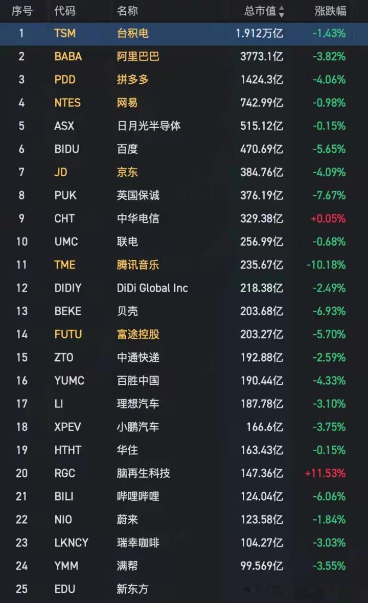 3. 中概股:42只集体下降,多只龙头跌幅超10%