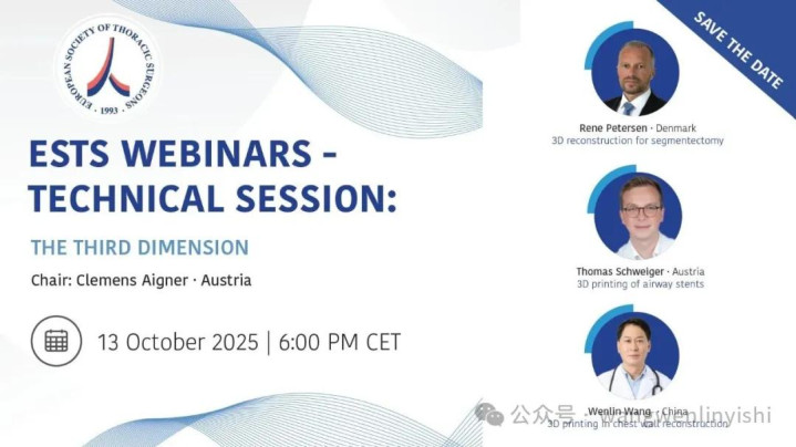 本日的会议是ESTS官方举办的专题会议。会议的主题是3D打印工夫在胸外科手术中的讹诈。大会邀请世界范围内最有名的三位巨匠从三个方面作念阐扬,分辩阐扬该范围的最新成立。