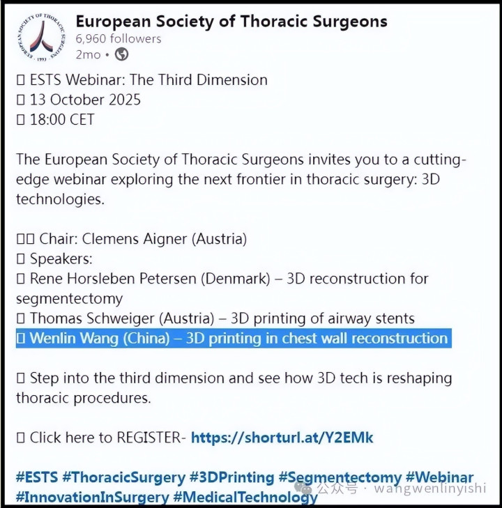【纲目】受大会主席Clemens Aigner涵养邀请,10月13日,看成大会特邀嘉宾插足了欧洲胸外科医师协会(European Society of Thoracic Surgeons,ESTS)召开的专题会议。这次会议的主题是3D打印工夫在胸外科手术中的讹诈。咱们的题目是:3D打印工夫在胸壁重建中的讹诈。咱们的责任受到世界巨匠的一致好评。