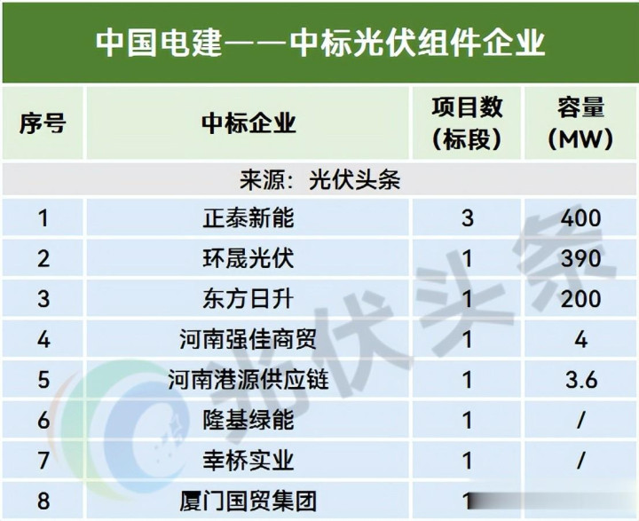 中国电建在本统计周期共有10个模式(标段)定标,明确界限997.6MW,正泰新能、环晟光伏、东方日升、隆基绿能等中标。