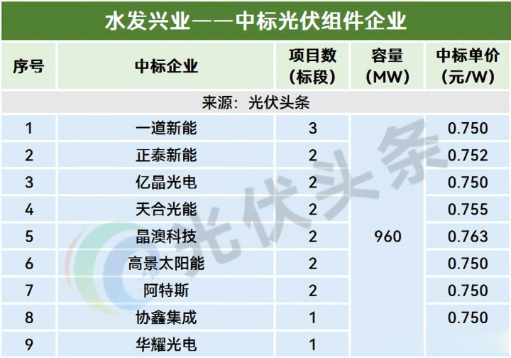 其中,高景太阳能最高中标单价为0.750元/W,中标模式为水发兴业控股有限公司年度光伏发电项眼光伏组件框架公约采购标段1、标段2。