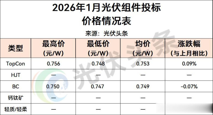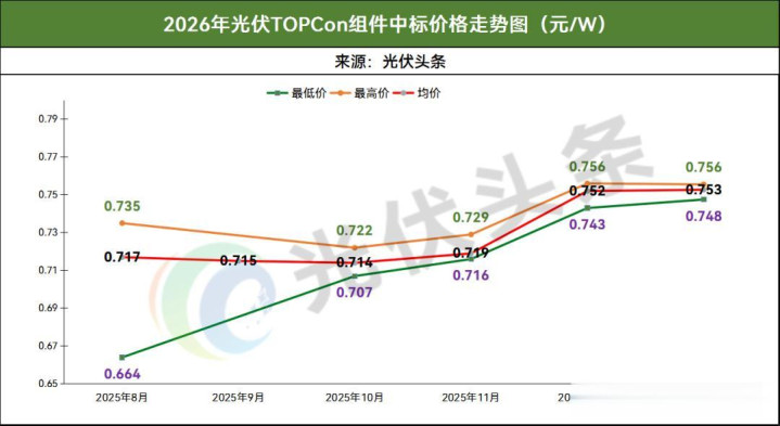 2026年1月,在已明确期间阶梯的模式中,光伏TOPCon组件定标价钱界限为0.748~0.756元/W,均价为0.753元/W。