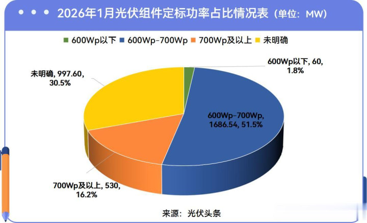 2026年1月,光伏组件定标模式中,除未明确功率外,600Wp以下占比1.8%,定标容量60MW。600Wp-700Wp占比51.5%,定标容量1686.54MW。700Wp及以上功率段组件定标容量530MW,占比为16.2%。