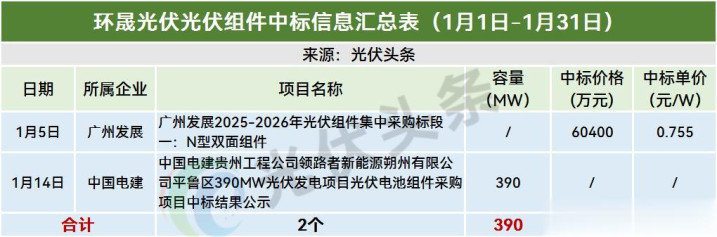 2026年1月,环晟光伏中标广州发展、中国电建等企业2个模式(标段),确定中标容量390MW。