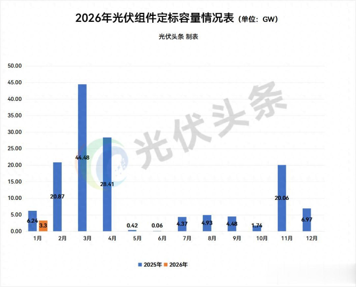 光伏头条左证公开信息统计,2026年1月定标3.3GW,与2025年1月定标6.24GW比较,定标界限呈下落趋势,同比下落47.10%。