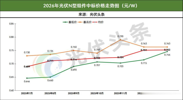 2026年1月,光伏N型组件定标价钱界限为0.746~0.763元/W,均价为0.752元/W。