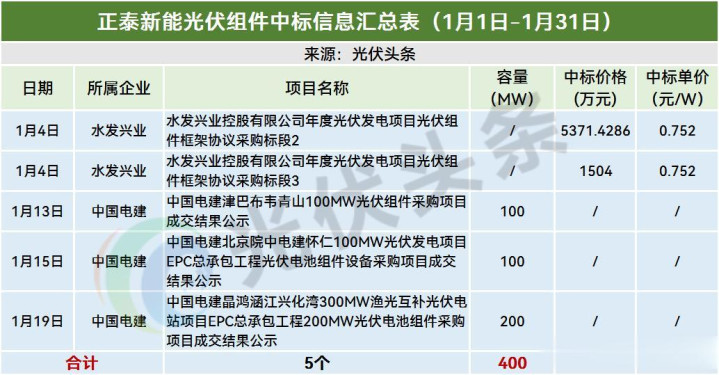 2026年1月,正泰新能中标水发兴业、中国电建等企业5个模式(标段),确定中标容量400MW。