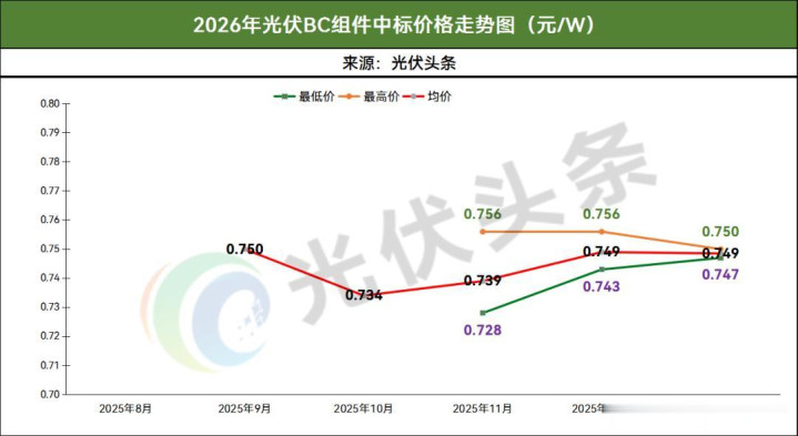 2026年1月,在已明确期间阶梯的模式中,光伏BC组件定标价钱界限为0.747~0.750元/W,均价为0.749元/W。