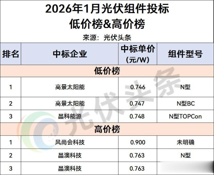光伏头条左证企业入围组件招标模式候选情面况,制作2026年1蟾光伏组件投标廉价榜&高价榜。细目如下: