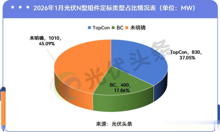 2026年1月定观点N型组件中,TOPCon组件明确界限830MW,占比达到37.05%。