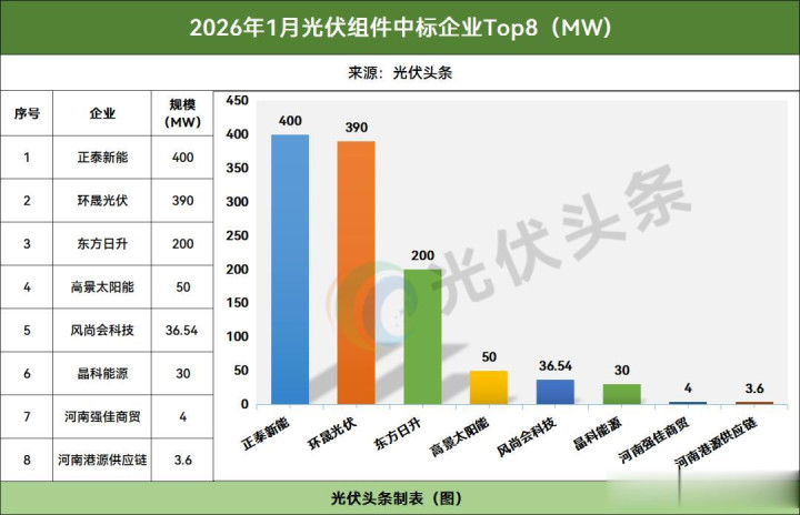 光伏头条左证公开信息统计,裁撤数个模式未公布企业本色中标界限外,在已确定中标模式容量中,正泰新能中标400MW,排名榜首;环晟光伏390MW,排名第二;东方日升中标200MW,排名第三。除此以外,高景太阳能(50MW)、习尚会科技(36.54MW)等也位列2026年1蟾光伏组件中标榜Top8。