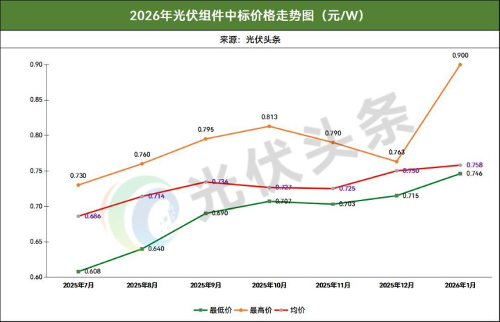 价钱走势方面,2026年1月,光伏组件订价界限为0.746~0.900元/W,均价为0.758元/W。