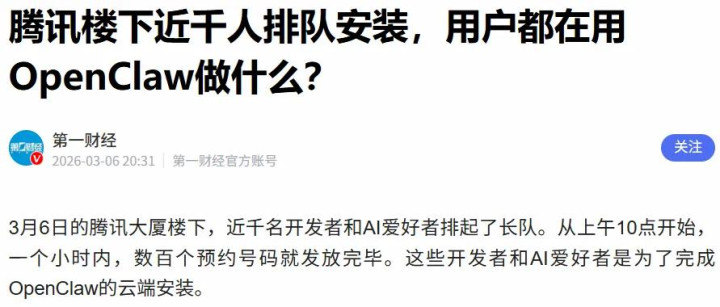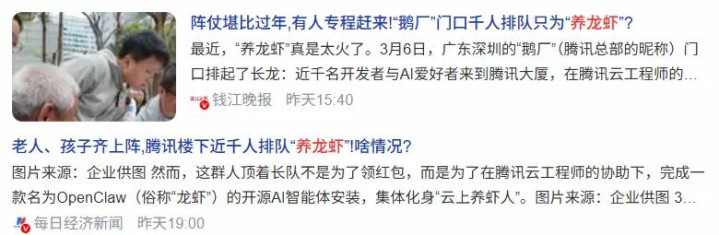 最近OpenClaw太火了,“养龙虾”成了潮水!3月6日腾讯文告免费装配OpenClaw,近千名深爱者在鹅厂门口排长龙,这神气有点像春运的高铁站一样壮不雅!