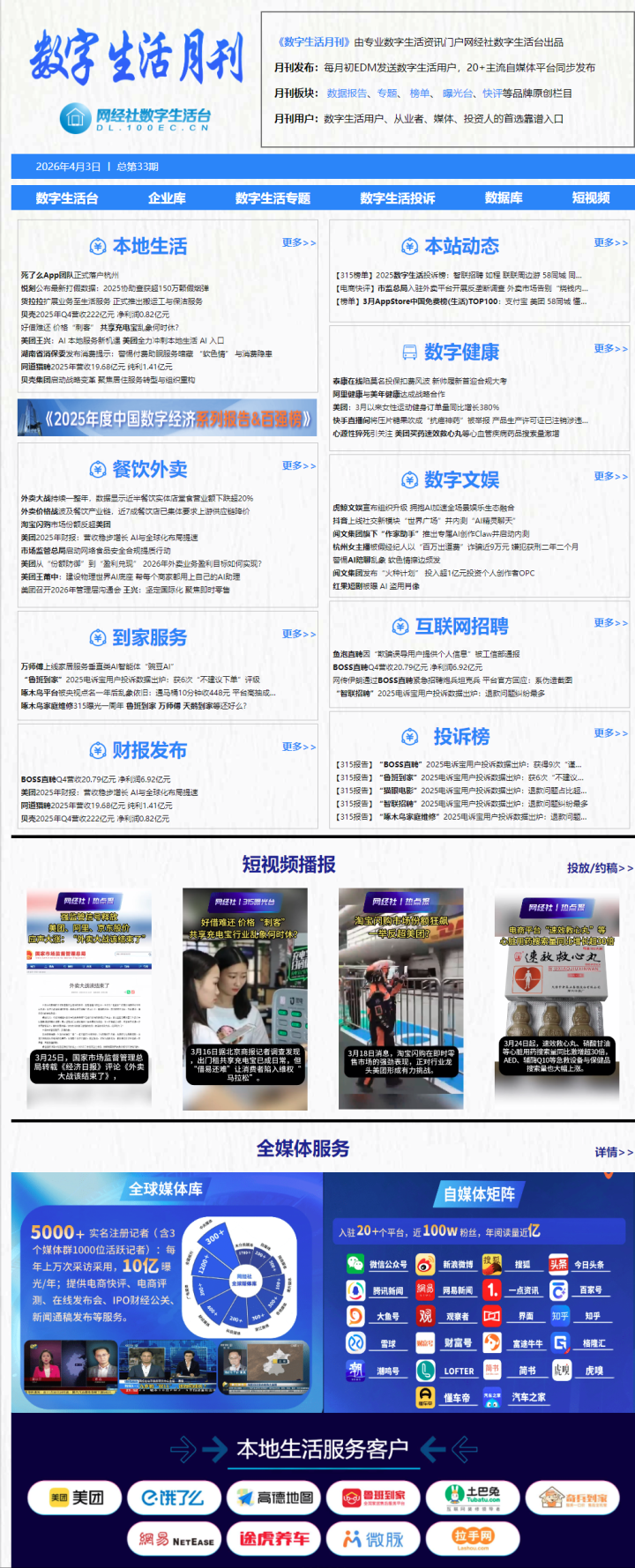 2026年2月,数字生涯领域又有哪些事?以下为数字经济新媒体#网经社 旗下数字生涯台为您带来本月土产货生涯、在线外卖、数字文娱、数字健康等赛谈最新动态转头。本月网经社共发布数字生涯内容48条,其中35条入选《3月数字生涯月报》。