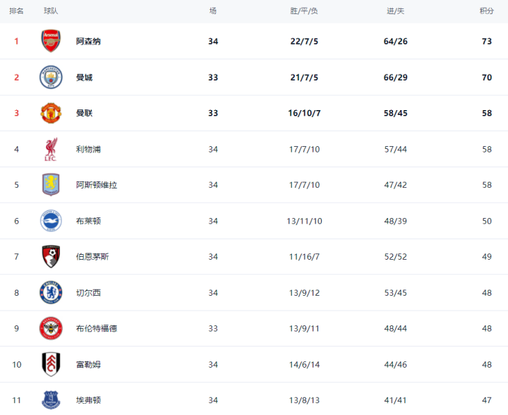在积分榜上,阿森纳22胜7平5负,总积分达到73分,从头登上榜首位置。曼城少赛一轮亚博体育,拿到70分,名循序2。曼联、利物浦和阿斯顿维拉王人是58分,名循序3到第5名。布莱顿50分名循序6。切尔西只拿到48分,排第8。赢球的热刺34分,名循序34,依然处于左迁区。